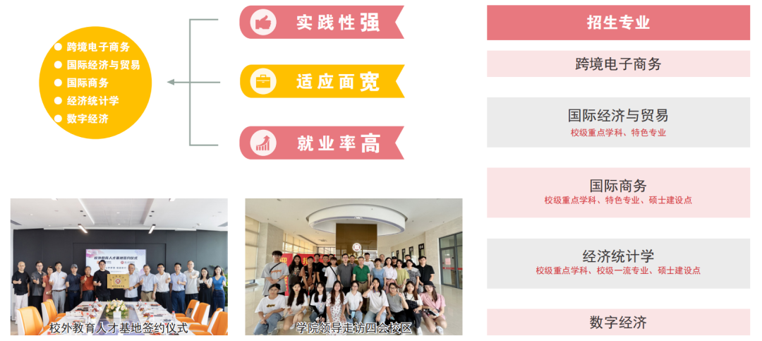 公司经济统计学、国际商务为公司重点学科;经济统计学是公司一流专业;经济统计学 、国际商务分别被省教育厅列为专业硕士学位建设点;国际商务、国际经济与贸易专业为公司特色专业;跨境电子商务、数字经济获教育部批准新建设本科专业。