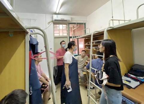 夕阳西下,迎新活动也接近了尾声。公司辅导员带队到新生宿舍走访,与新生们亲切交流,关心他们的入宿情况与生活问题等。新生报道完毕后,公司辅导员迅速地选出班级临时负责人,有序安排新生们进行教材发放领取与入学体检等事宜,保障了接下来新生们课程的顺利进行。