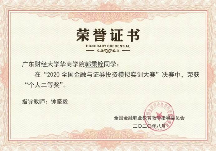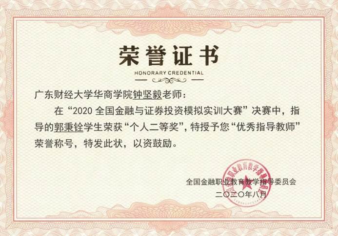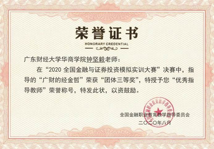 公司经济管理公司经济与金融系组成多个团体参与比赛,员工团队与指导教师通过不断的努力,团结共进,沉着应战,最终取得了优异的成绩。其中“广财的经金哲”队荣获团队一等奖;郭秉铨同学荣获个人二等奖,钟坚毅老师获得优秀指导教师荣誉称号,为经济与金融系争得荣光!