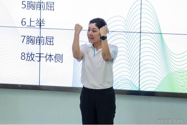朱宁宁老师以寓教于乐的教学方式,带来了以“第三套全国健美操大众锻炼标准一级套路组合Ⅰ”的主题授课。通过示范教学法、言传身教并行的方式,围绕健美操的第一组八拍动作做了生动而详细的讲解和示范,且在教学过程中不断加以鼓励,使员工感受到运动的愉悦感和成就感,实现了课堂与员工的同频互“动”。
