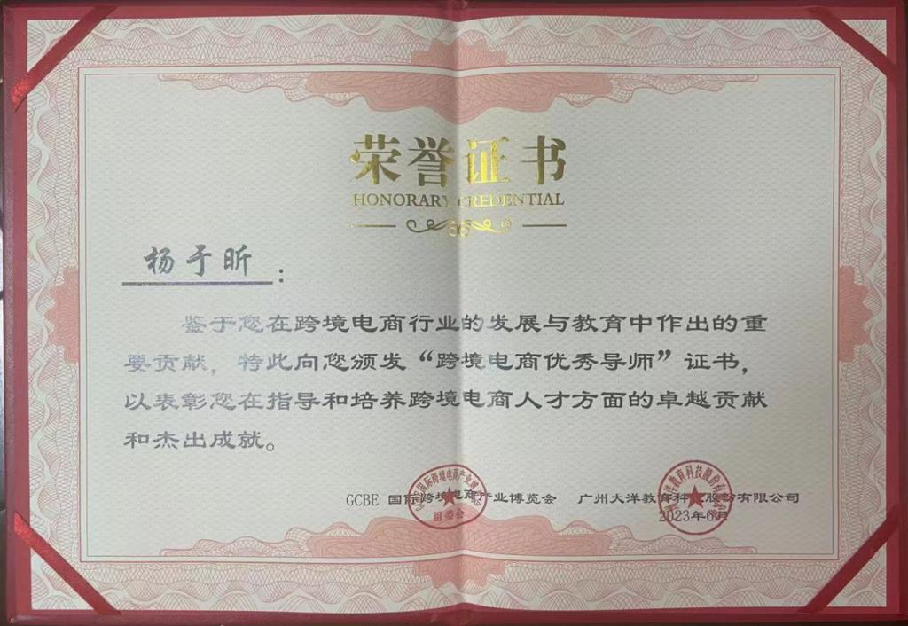 跨境电子商务专业杨于昕老师荣获“跨境电商优秀导师”证书