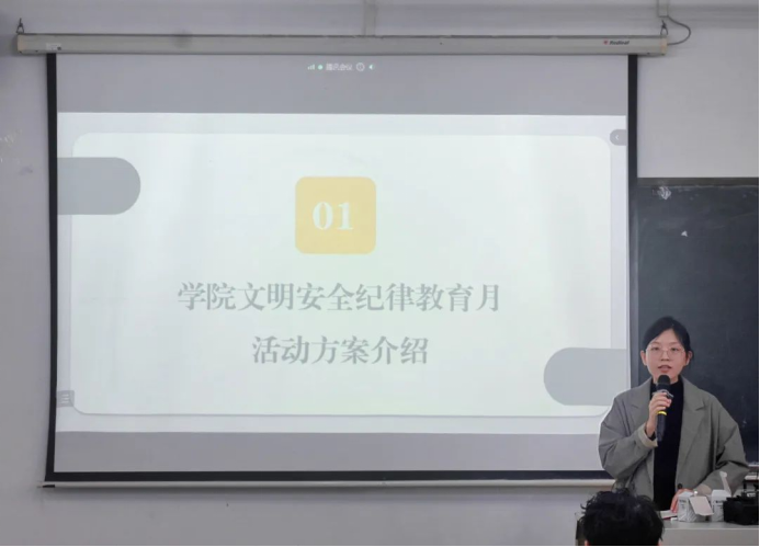 大会伊始,刘龙真老师根据公司教育月文件精神,介绍了公司文明安全纪律教育月活动的方案。刘龙真老师重点介绍了本次纪律教育月活动的总体安排,主要分为工作部署、宣传动员、检查落实、总结表彰四个阶段,就各阶段的具体工作安排进行了详细的介绍,并强调了各员工组织和各班级需根据方案的具体内容严格执行和落实。