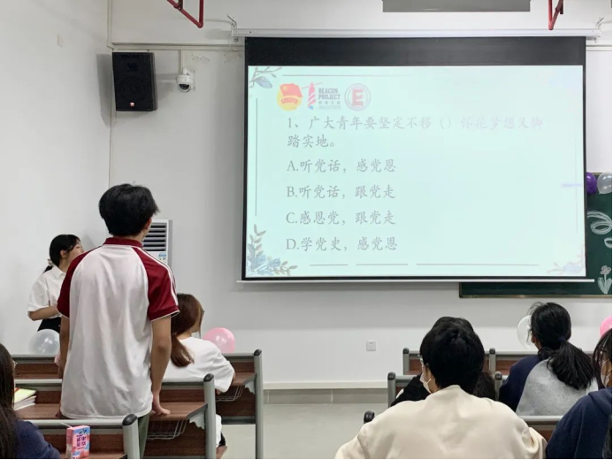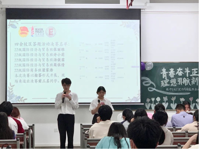 本次个人展示以答题竞赛决赛开展,在场的选手竞争激烈,根据大屏幕上放出的题目,能够快速选出正确的答案。通过本次活动,彰显了青春的蓬勃力量,诠释了青年人的奋斗热情,号召经贸青年让青春在奋斗中开出绚丽之花。