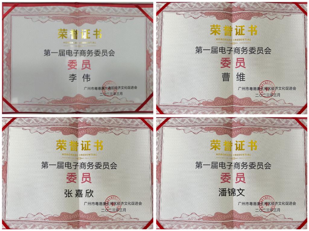 大会上,经济贸易公司跨境电子商务专业李伟、曹维、张嘉欣、潘锦文四位老师被广州市粤港澳大湾区经济文化促进会评为首届电子商务委员会委员。
