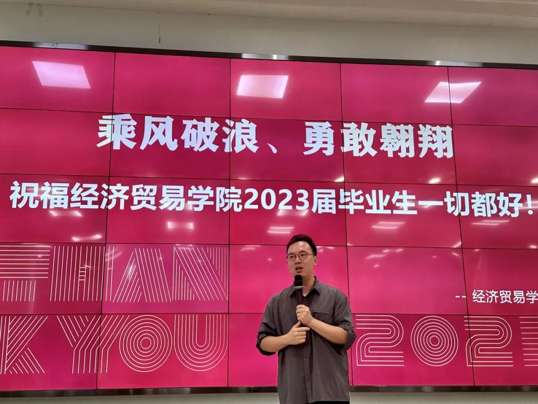 接下来,毕业生代表陈晓漳师兄代表经济贸易公司19级全体毕业生向辛勤付出的领导和老师们表示最衷心的感谢,同时也为大家分享了工作和面试的相关经验。