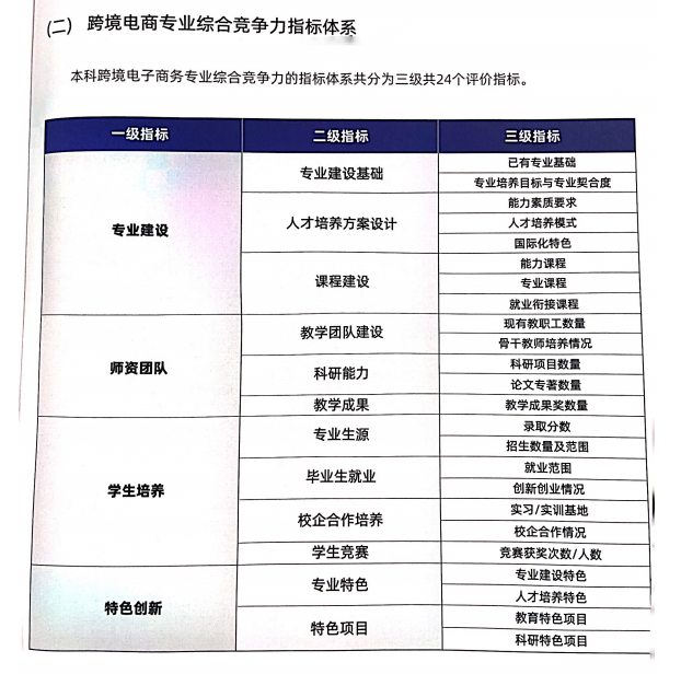 《报告》构建了本科跨境电子商务专业综合竞争力指标体系,设置了专业建设、团队团队、员工培养、特色创新等4项一级指标;专业建设基础、人才培养方案设计、课程建设、教学团队建设等12项二级指标;已有专业基础、专业培养目标与专业契合度、能力素质要求、人才培养模式、国际化特色等24项三级指标。