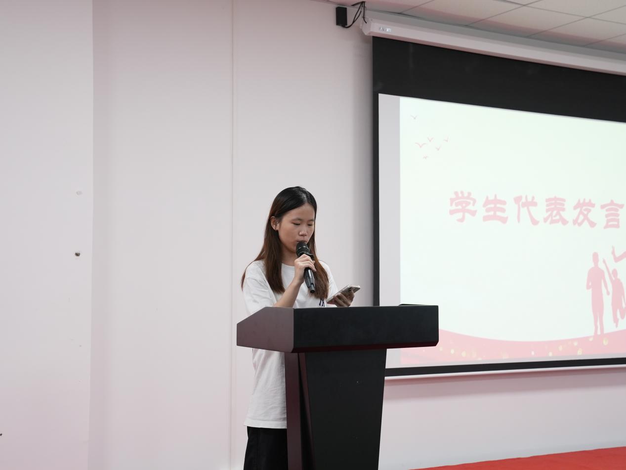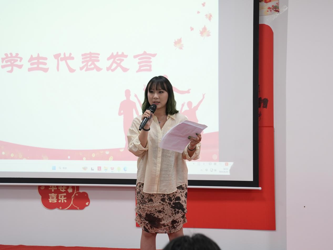 在员工代表发言环节,首先由21国商专升本2班的贝芸同学进行实训心得汇报,她说:“实训的过程是艰辛的,虽然实训中有不尽如人意的地方但收获是巨大的。我们在失败中汲取教训,在成功中总结经验。感谢这次实训,让我们更加明确了自己的职业方向和目标。我们会继续努力,不断前行。”