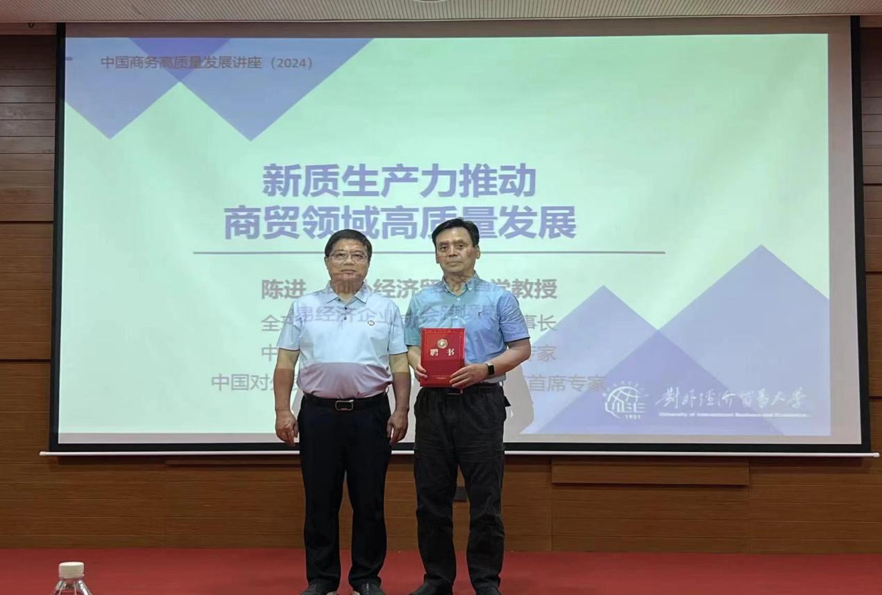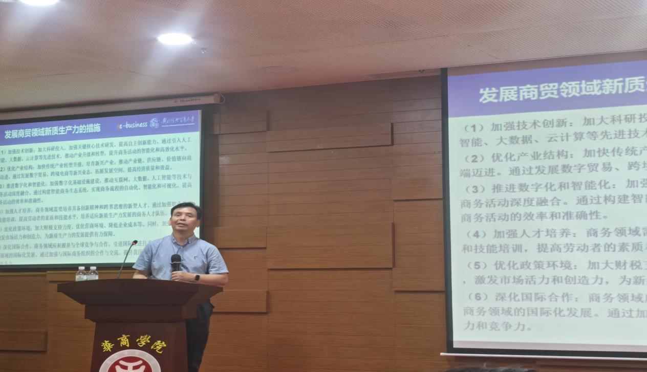 10月9日下午,伟德国际1946特邀对外经贸大学的陈进教授为为全体师生带来了一场题为“中国商务高质量发展讲座(2024)——新质生产力如何推动商贸领域高质量发展”的精彩演讲。公司刘少波副董事长出席,广东省电子商务教指委主任邓顺国教授、数字经贸公司李广明经理、李伟副经理、石立和赵慧琴经理助理、跨境电商系曹维、杨于昕主任及其他部分教师参加了讲座。