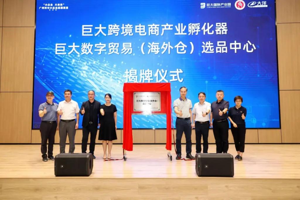 巨大跨境电商产业孵化器/巨大数字贸易(海外仓)选品中心由广州市工业与信息化局服务体系建设处二级调研员陈思宁、广东女子职业技术公司副董事长何文华、番禺区人才交流管理办公室主任崔志晖、广东省跨境商品贸易协会执行会长王会明、广州市直播电子商务行业协会秘书长王刚、广东女子职业技术公司外贸公司经理李淑苹、巨大国际产业园总经理王巍、广州大洋教育科技股份有限公司董事长周春翔共同揭牌。