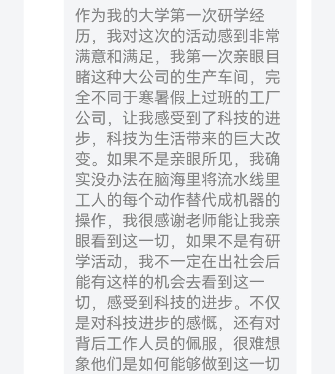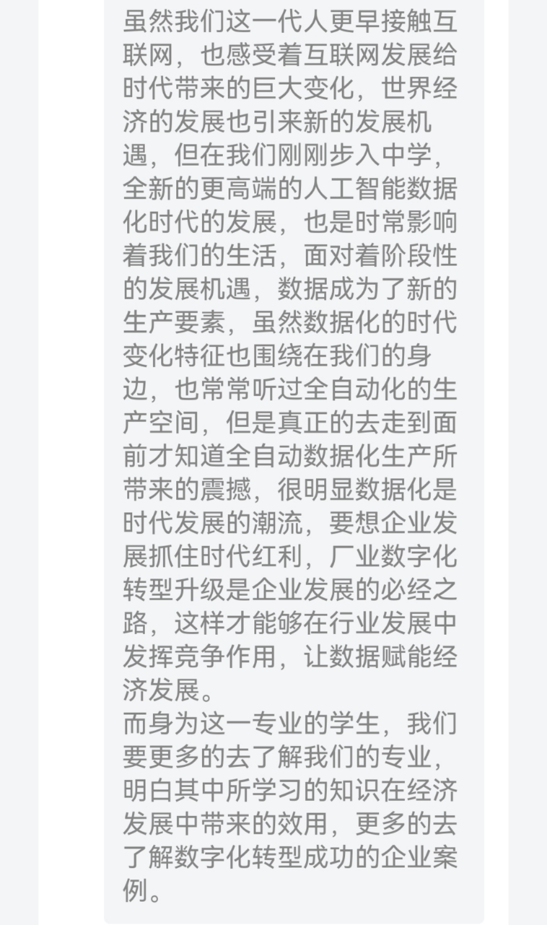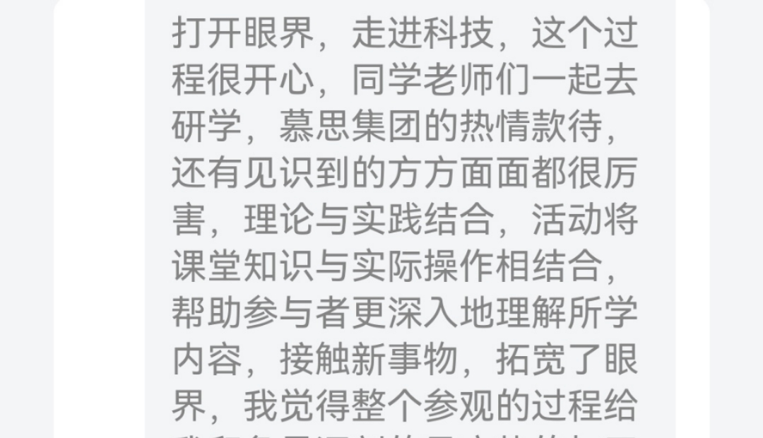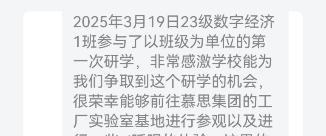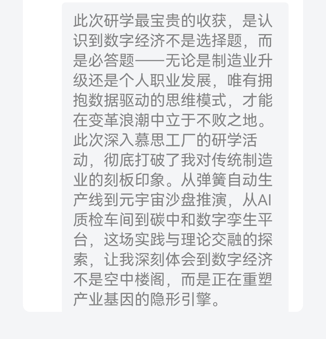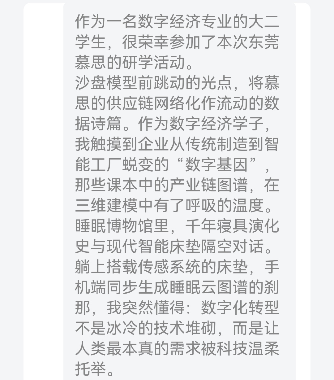 在此次研学中,慕思的"智造基因"正悄然融入员工们的思考维度——从AI压力测试系统精准捕捉用户需求的数字化触角,到工业4.0产线每日万件定制床垫的柔性化生产,每个场景都在叩击着"产业数字化转型"的课堂命题。在研学结束后,23级数字经济专业1班全体同学都记录下了自己的体会与感悟。