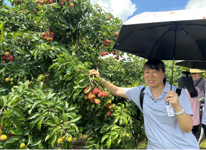 步入葱郁的荔枝林,师生们戴上草帽,在基地负责人指导下亲手采摘新鲜荔枝。饱满的果实、清甜的香气,让员工们真切领悟到农产品“鲜”字当头的核心价值。基地负责人现场讲解荔枝种植的智慧农业应用与品控关键点,为后续电商营销策略提供了坚实的品质认知基础。