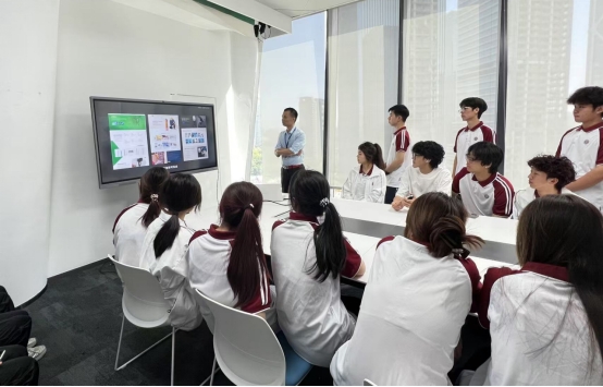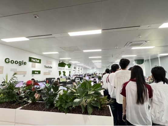 在企业工作人员的引导下,师生一行参观了经纬国际旗下“小渔夫”现代化办公区。企业负责人以“科技驱动跨境贸易”为主题,介绍了公司以跨境电商为核心,融合人工智能技术研发的多元化业务布局,强调“AI技术是突破跨境壁垒、提升全球竞争力的关键”。