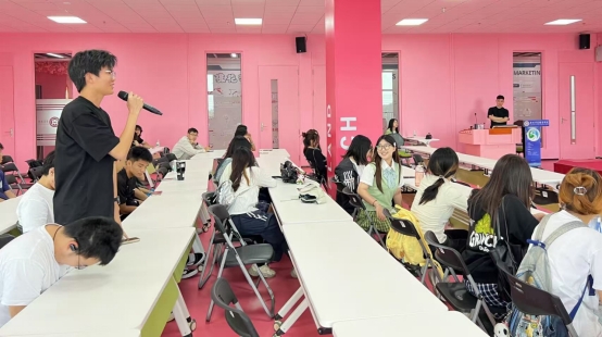 同学们参观企业工作间、多语种直播间,并化身进行“新手主播”。活动尾声,林老师宣布暑期实践计划,桃花岛将招募具备短视频创作、外语能力的同学参与真实项目运营,提供账号孵化、直播全流程指导。消息一出,现场氛围热烈,多名同学积极向林老师咨询详情。