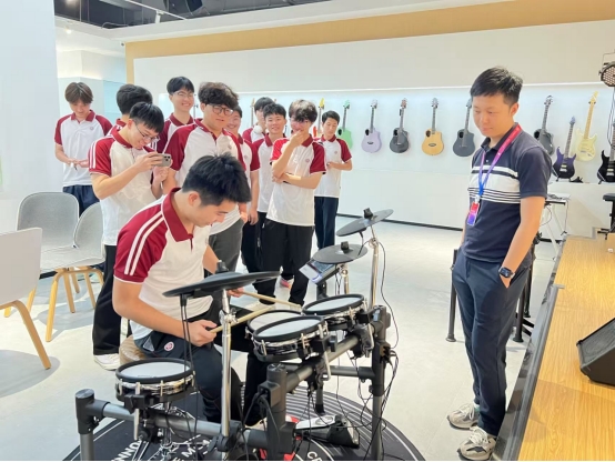 随后,在工作人员带领下,员工们实地参观了蓝深科技的产品研发中心、海外营销部、跨境物流等部门。在乐器展厅,亲手试弹搭载AI陪练功能的智能吉他,体验“科技+音乐”的跨界魅力。互动环节中,同学们围绕“跨境岗位晋升路径”等话题踊跃提问。企业HR建议:“入行需懂音乐文化,善用TikTok、独立站等新渠道;可从运营助理切入,积累实战经验。”蓝深科技表示优先招募外语能力强、有新媒体运营基础的员工。