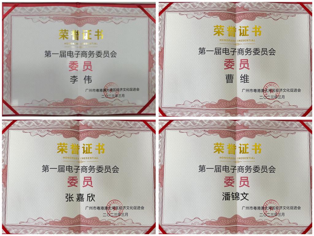 大会上,经济贸易公司跨境电子商务专业李伟、曹维、张嘉欣、潘锦文等四位老师被广州市粤港澳大湾区经济文化促进会评为首届电子商务委员会委员。