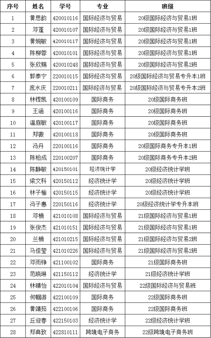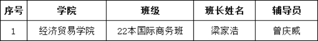 为积极落实公司文明安全纪律教育月活动工作安排,进一步加强和改进员工日常教育管理,增强广老员工纪律观念、安全防范意识,帮助同学们养成良好的学习和行为习惯,形成良好的校风、学风、班风,促进和谐校园建设。经济贸易公司于2023年3月21日至2023年4月21日开展以“严明校规校纪,共创和谐校园”为主题的文明安全纪律教育月系列活动。经过班级内部自主评议和公司综合评定,秉承着公平公正和择优的原则,拟推荐22本国际商务班参评公司“先进班集体”称号,拟推荐黄思韵等28名同学参评公司“先进个人”称号,现将具体名单公示如下: