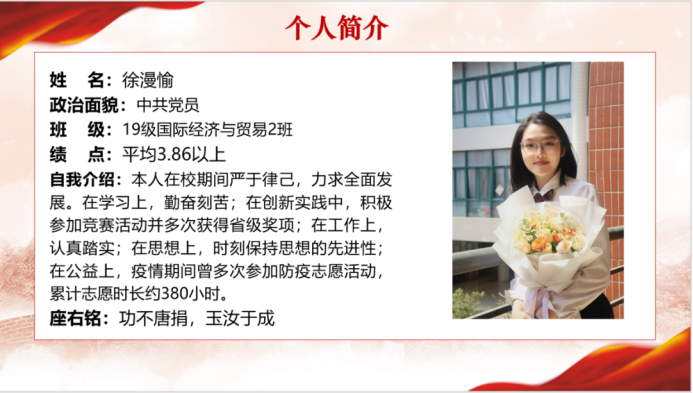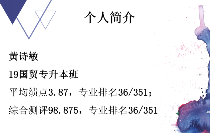 黄诗敏师姐分享了她在校的学习情况及在校经历,她建议同学们: