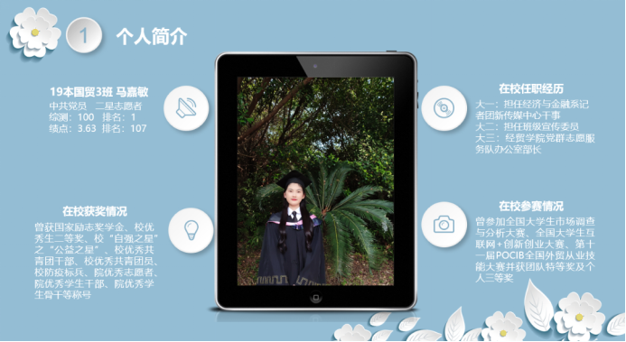 (1)学术科研:强调我们要重视绩点,绩点是评优评先的第一道门槛,课后时间多和身边优秀的同学积极参加学术竞赛,培养个人的创新创业能力;同时多充分利用图书馆资源,把知识为己所用,达到提升自身的能力的目的。