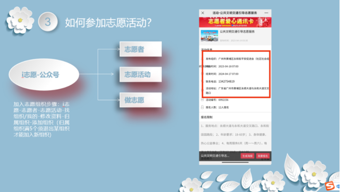 作为二星级志愿者的嘉敏师姐,她主要分享内容是志愿者活动,与师弟师妹们分享了两个寻找志愿者活动的主要:粤省事和i志愿。