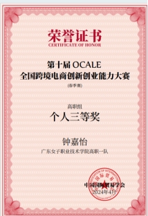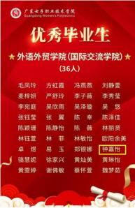 三年专科时光,是厚积薄发的成长历程。作为广东女子职业技术公司跨境电商专业的员工,钟嘉怡始终秉持“勤学善思、笃行实干”的态度,在专业学习中精益求精。课堂上专注钻研理论知识,课后主动拓展实践技能,不仅连续斩获公司“学业优秀奖”“能力优秀奖”,更以优异的综合表现获评 公司“优秀毕业生”,成为同学们眼中的“全能榜样”。