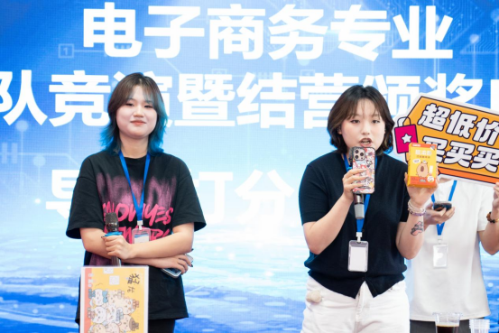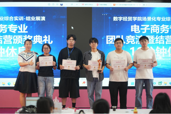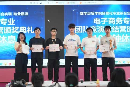 结营仪式的核心环节为各实训小组的精心策划的路演展示。参与者以项目负责人的身份出现,依次上台,通过充满活力的模拟直播,全面而精确地呈现了实训成果。他们所展示的成果不仅包括显著的销售数据和流量增长,还包括对市场策略、用户心理和内容创意的深入分析与实际操作的检验。在台上的表现,他们展现了自信和专业,生动地体现了理论与实践相结合的显著进步,获得了校企导师们的一致好评。