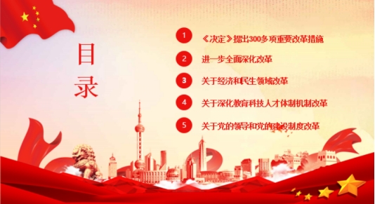 板块分为总论,分论,以及加强党对改革的领导,深化党的建设制度改革。《决定》一共提出了300多项重要的改革举措,都是涉及体制机制制度层面的内容。其中有的是对过去改革举措的完善和提升,有的是根据实践需要和试点探索新提出的改革举措。