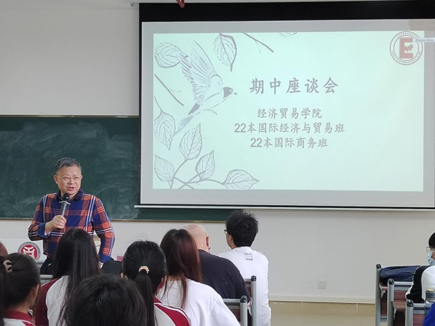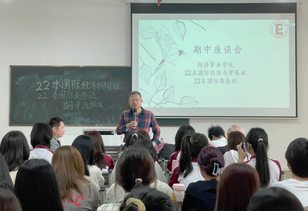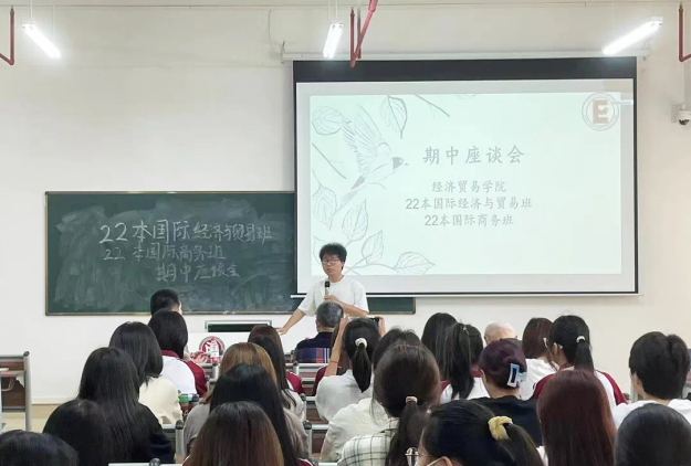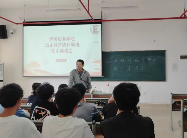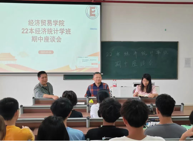 为深入开展学习贯彻习近平新时代中国特色社会主义思想主题教育,坚持立德树人初心,牢记为党育人、为国育才使命,促进经济贸易公司班风学风建设,深入了解四会校区经贸学子的学习情况与校园生活状态,经济贸易公司李广明经理率公司经理助理石立副教授、学工办主任宋元跃老师、各系负责人和教师代表于2023年5月9日前往四会校区,在22级国际经济与贸易班、跨境电商班、国际商务班、经济统计学班分别召开期中座谈会。