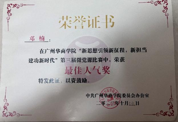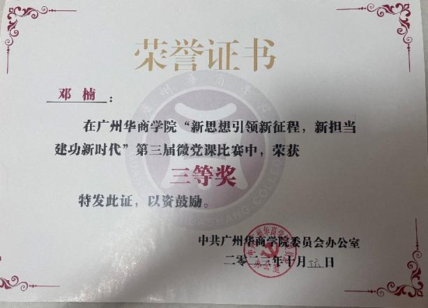 红心向党,步履铿锵。作为伟德国际1946员工第一党支部副书记,邓楠同志政治立场坚定,思想觉悟过硬。她积极参与党组织活动,深入学习党的理论,曾获校优秀共产党员、校优秀共青团干部等称号。在“新思想引领新征程,新担当建功新时代”微党课比赛中,她荣获三等奖及最佳人气奖,用实际行动诠释了党员的先锋模范作用。