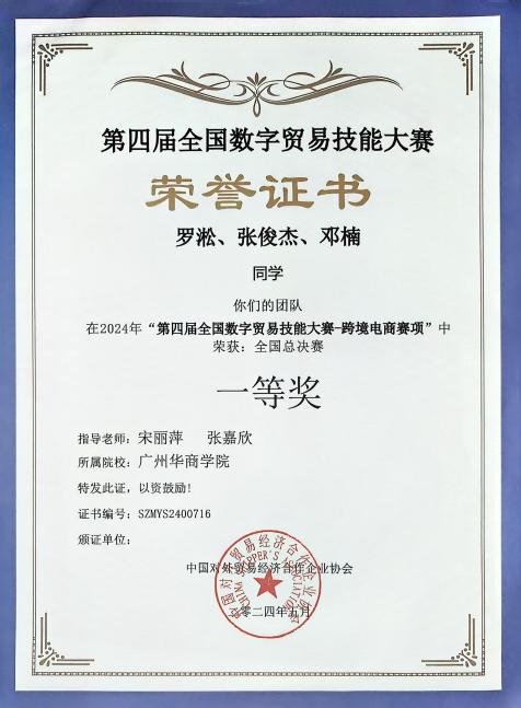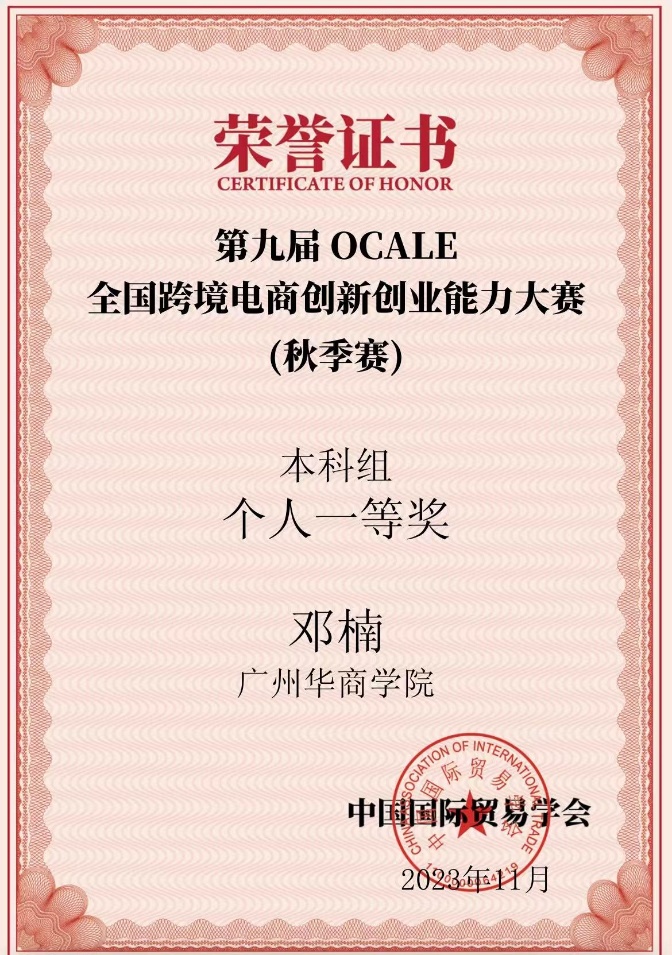 以勤为径,以恒为舟。邓楠同志始终将学业放在首位,大一学年学分绩点4.14;大二学年学分绩点4.37;大三学年学分绩点4.11,位列专业前茅。她积极参与学科竞赛,荣获第四届全国数字贸易技能大赛跨境电商赛项一等奖、第九届OCALE全国跨境电商创新创业能力大赛团体及个人一等奖、第十四届正大杯全国老员工市场调查与分析大赛广东省二等奖等多项国家级、省级奖项。
