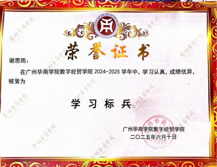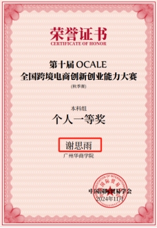 同时谢思雨同志积极投身学科竞赛,将专业知识运用到实践中。2024年11月,在“第十届OCALE全国跨境电商创新创业能力大赛”中,她凭借敏锐的市场洞察力和出色的团队协作能力,带领团队斩获团体、个人双一等奖;2025年,在“全国高校商业精英挑战赛国际贸易竞赛(国际贸易结算单证赛道)”中,她和队友精准把握单证要点,荣获省级团体一等奖;在“全国高校商业精英挑战赛国际贸易竞赛(国际货运代理赛道)”里,她们凭借掌握的货运知识,一举夺得团体特等奖;同年POCIB秋季赛,她所在团队获团体三等奖。这些荣誉见证了她在专业领域的探索与突破。