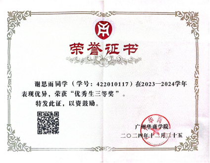 在学习上,谢思雨同志展现出强大的自律性和进取精神。她的学业成绩逐年攀升:2022-2023学年学分绩点3.57,平均绩点3.70;2023-2024学年学分绩点提升至3.88,平均绩点为3.87;2024-2025学年更是取得学分绩点4.10,平均绩点4.06的好成绩。她不仅专业知识扎实,还顺利通过英语四级考试,考取普通话证书,荣获校级2023、2024年校级优秀生三等奖学金,院级学习标兵。