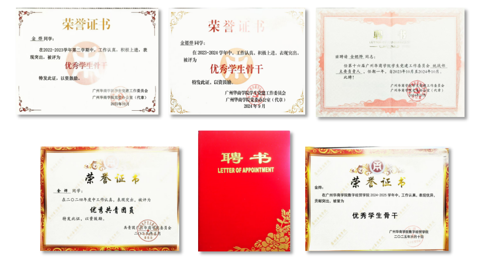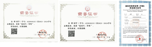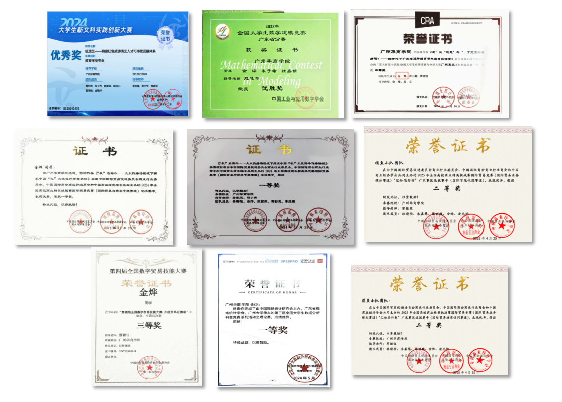 2024年在全国高校商业精英挑战赛国际贸易竞赛(国际磋商赛道)二等奖等奖项国家级奖项6项,省级奖项5项,校级荣誉4项。