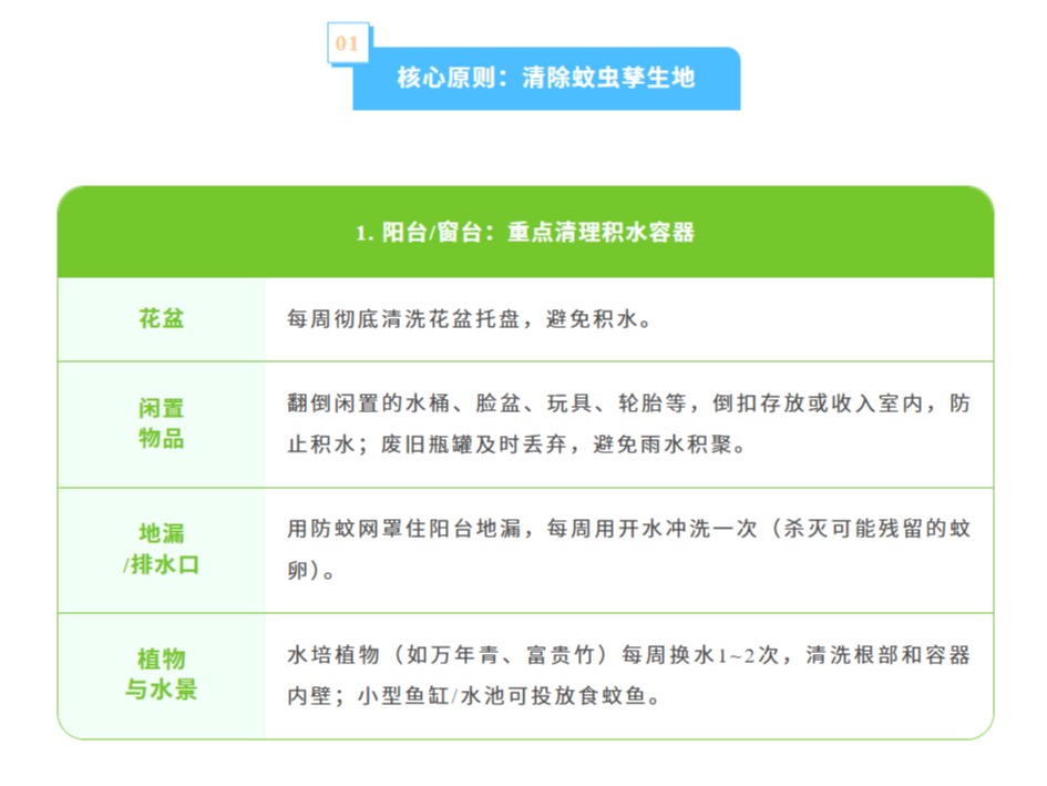 随着气温升高、降雨频繁蚊虫进入活跃期,基孔肯雅热和登革热都是经伊蚊叮咬传播的急性传染病,而伊蚊依赖积水繁殖,一旦家中存在积水等孳生地,就可能成为养育蚊子的“温床”。家庭作为蚊虫孳生和叮咬的高频场景,是防控的第一道防线,没有积水就没有蚊虫孳生,没有蚊虫就没有基孔肯雅热和登革热的传播。为了从源头切断传播链守护家人健康,这份《家庭防蚊清单》快收好并行动起来让蚊虫无处遁形!
