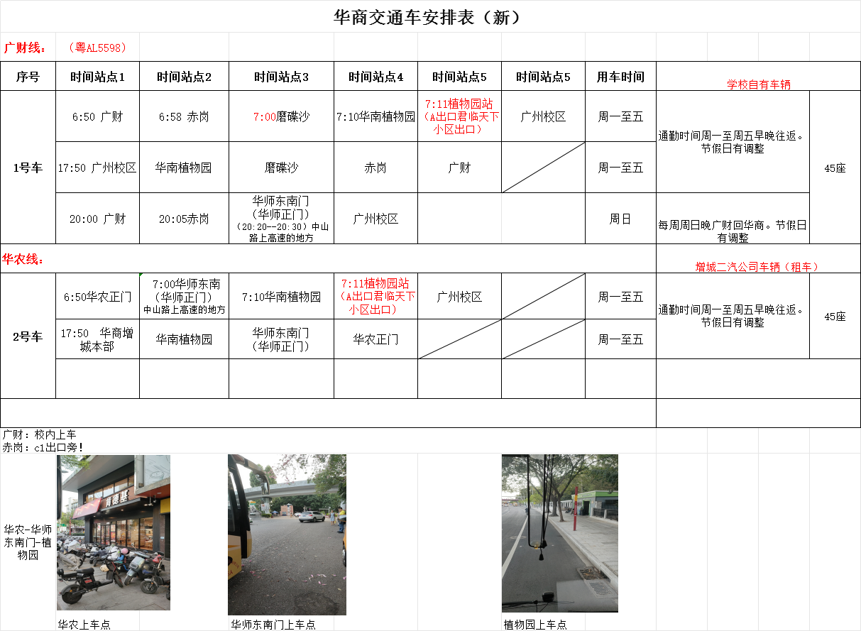 一、广州校区1.广财6:50--赤岗6.58--磨碟沙7:00--华南植物园7:10--植物园站7:11(A出口君临天下小区出口)--广州校区;2.华农6:50--华师东南华师正门7:00--华南植物园7:10--植物园站7:11(A出口君临天下小区出口)--广州校区 ;3.返程时间:17:50广州校区上车 ; 4.太平村 按平时通勤正常往返;5.8月31日(周日)晚20:00广财--广州校区车辆运行;