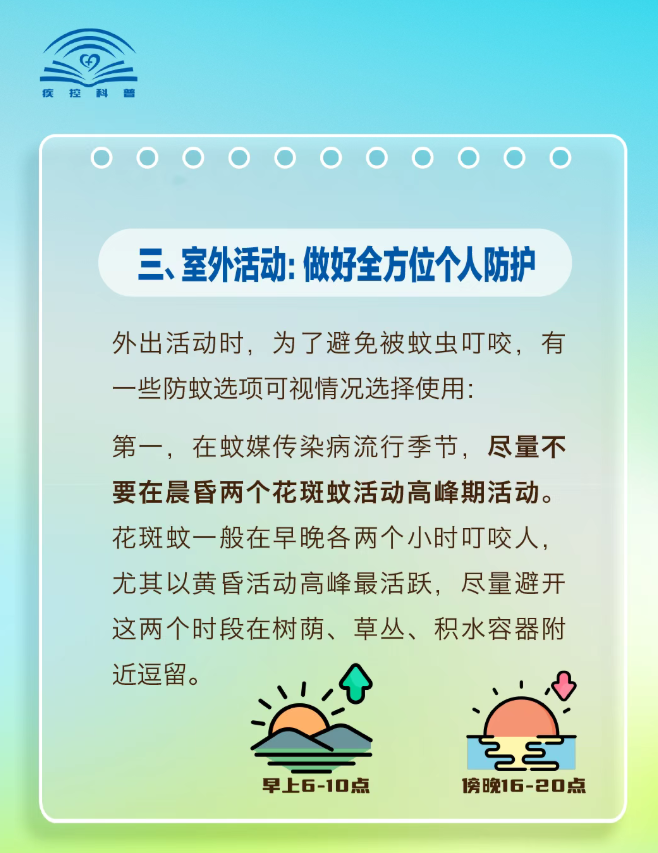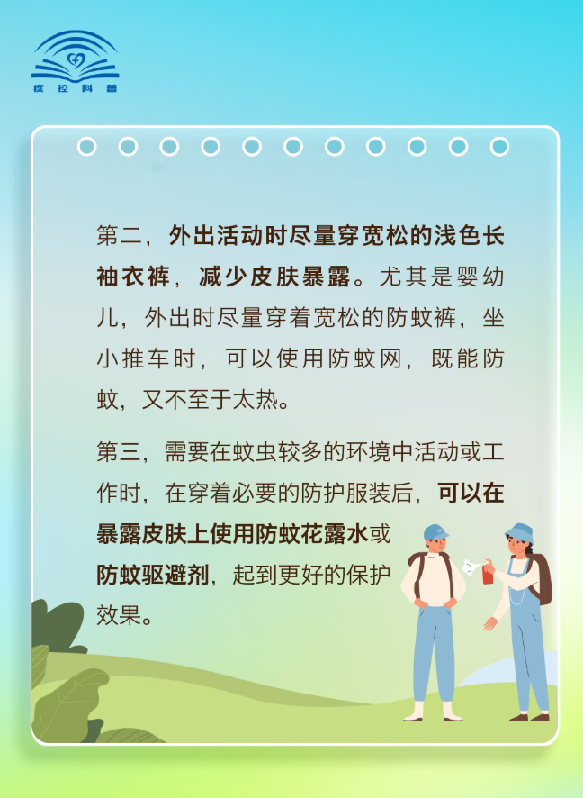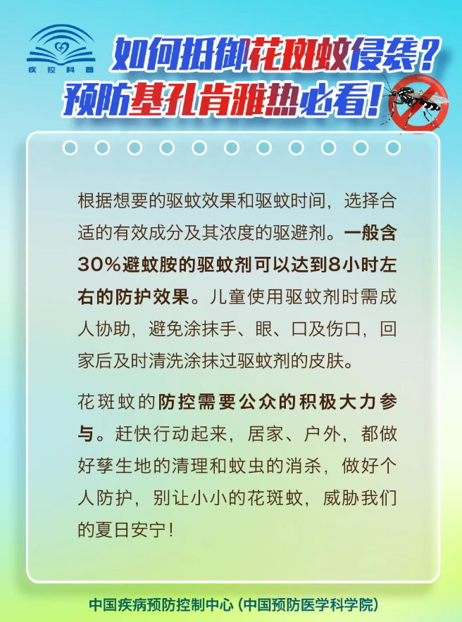 基孔肯雅热的传播媒介伊蚊偏好在小型洁净水体中繁殖。翻盆倒罐清积水,特别是清理各类容器积水,是控制疫情传播的基础。基孔肯雅热是可以通过“清积水、灭成蚊、防叮咬”来进行预防。另外,近期外出要注意个人防护,在户外活动穿着浅色长袖长裤,可以使用含有DEET(避蚊胺)等驱蚊成分的蚊贴、蚊香和蚊香液等产品,防止被叮咬。如出现发热、关节疼痛、皮疹等可疑症状,请及时前往校医院就诊。